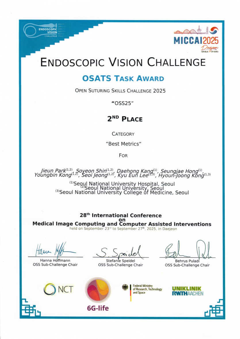 - 수상결과 : Open Suturing Skills Challenge 2025 - OSATS TASK AWARD 2nd Place 수상