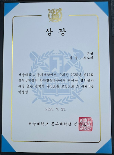 서울대학교 공과대학 주최 2025년 제14회 창의설계축전 창작활동 부문 은상 수상